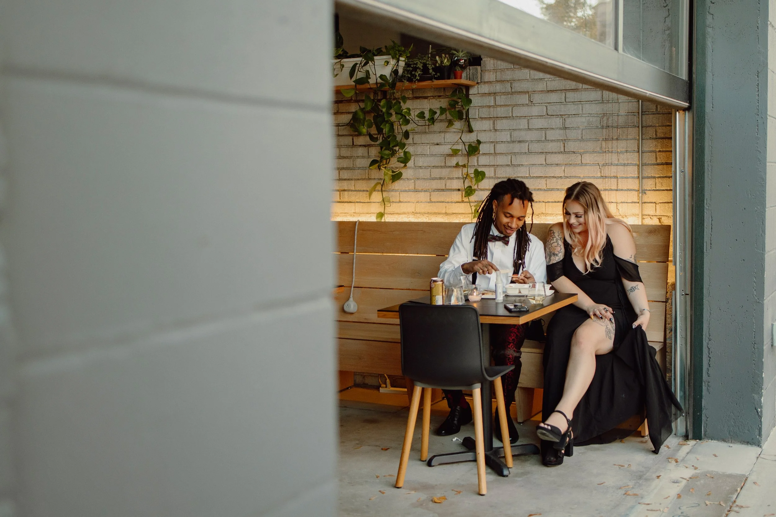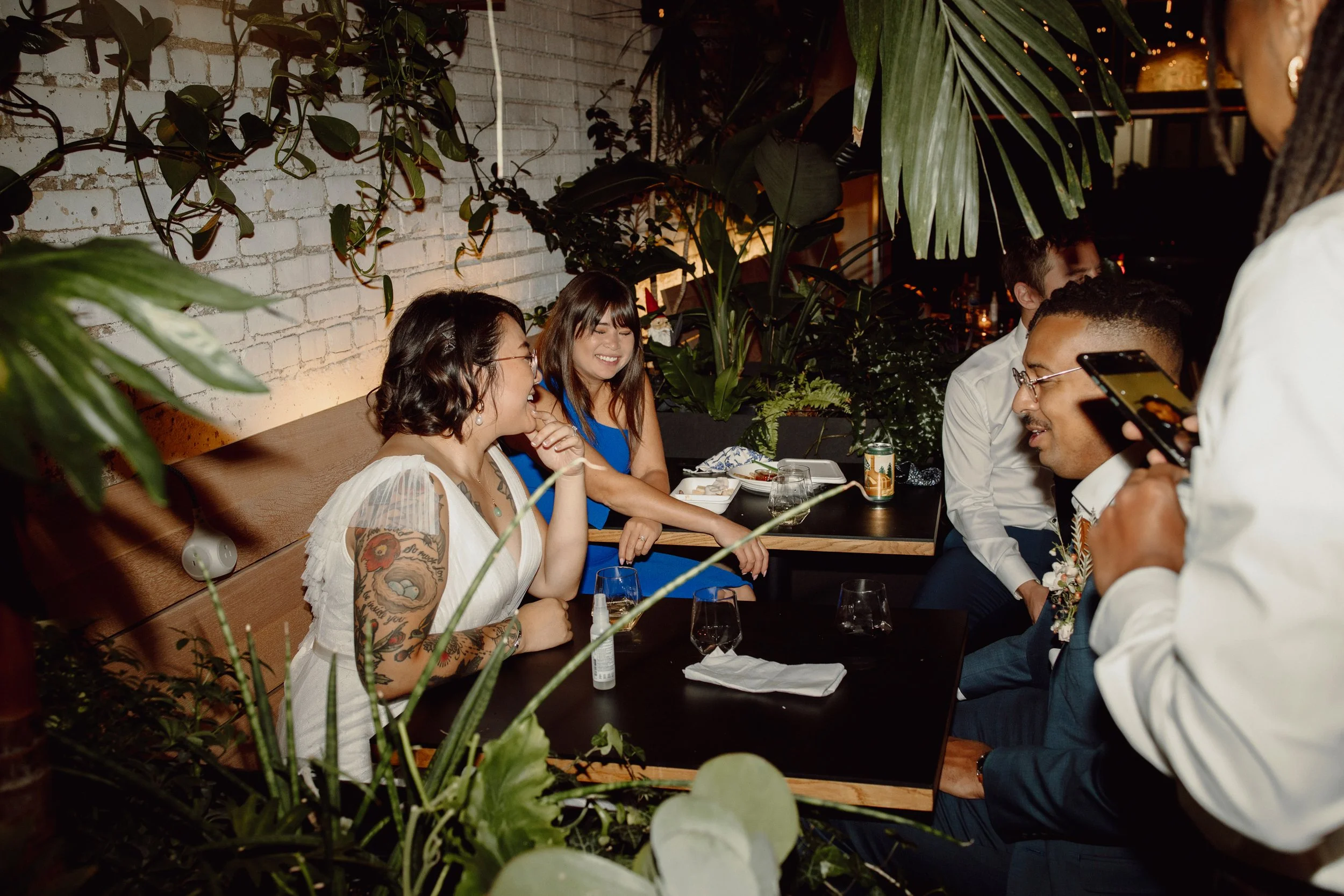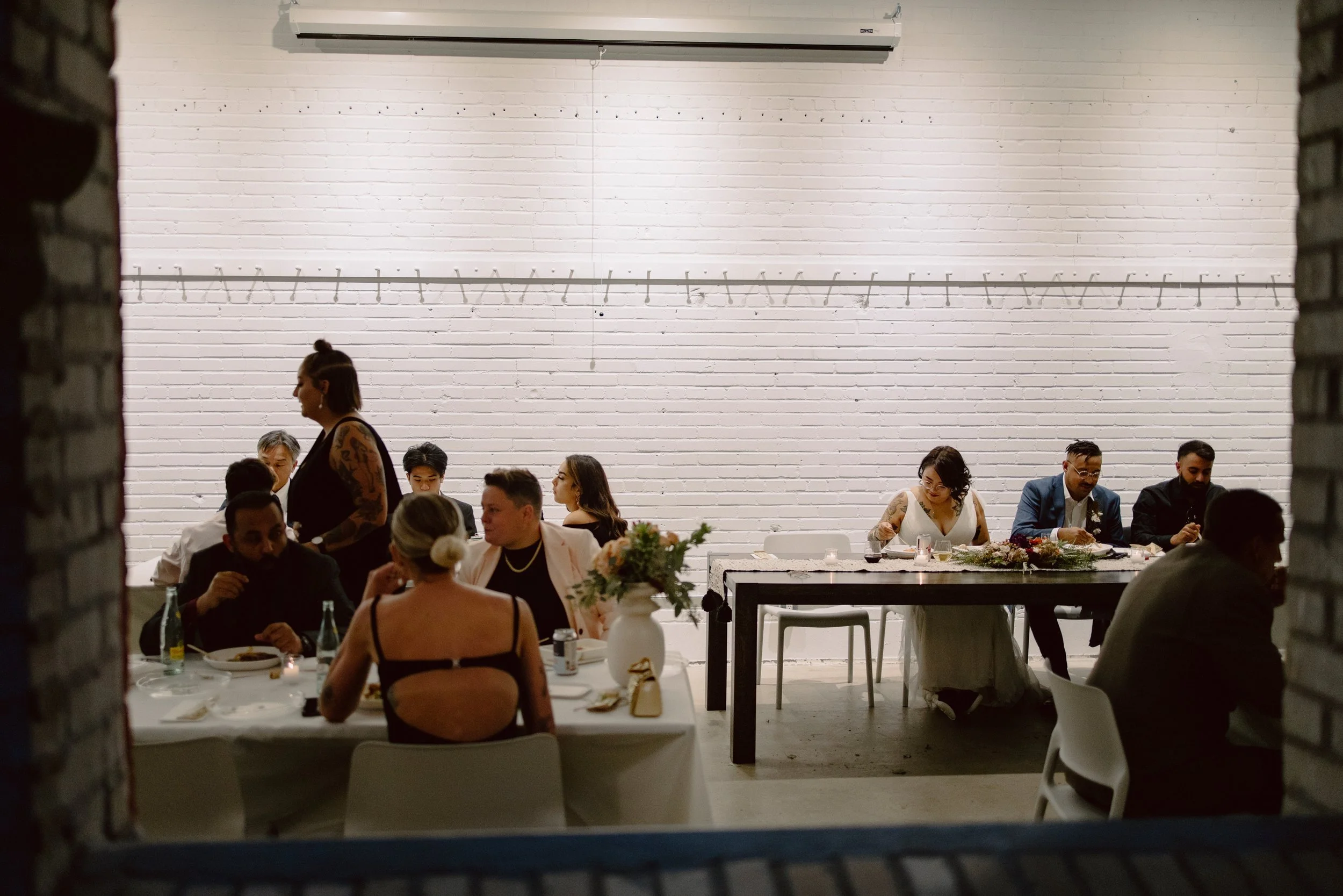 Couple arrives at The Annex, welcome toasts, seated for dinner