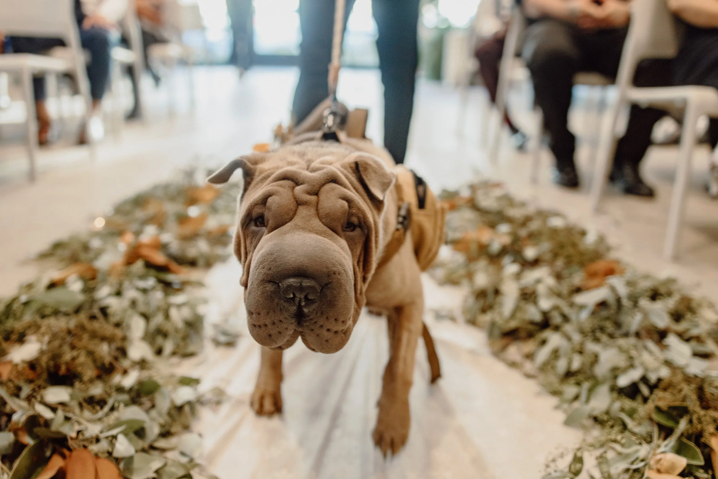 I’d make this a flower-free wedding and lean into the greenery already present in the space; option to add personal flowers from a neighborhood florist